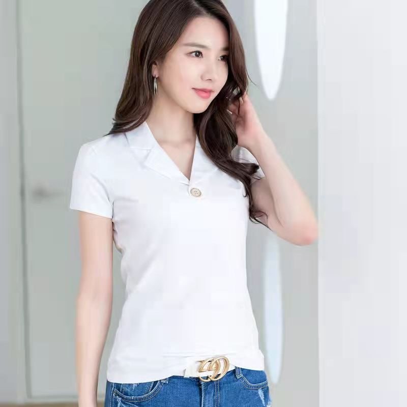 100KG可穿西装领短袖T恤女Polo衫韩版气质优雅V领复古素色衬衫女翻领t恤大码工作服高品质